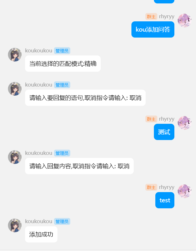 当发送上面指令后,kou会让您发送触发语句(会触发回复语句的群消息)